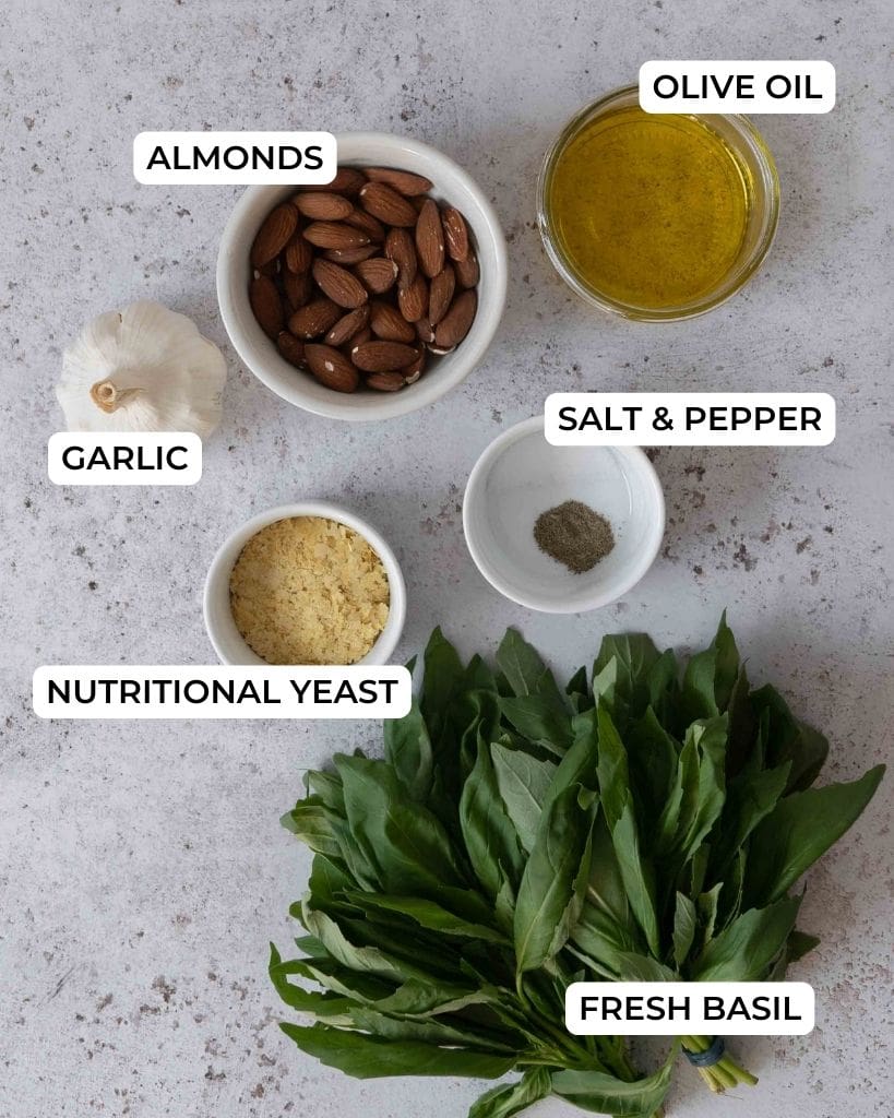 - Add all of the pesto ingredients to a food processor*, starting with 1/4 tsp salt.60 g almonds, 60 g fresh basil leaves, 7 g nutritional yeast, 75 ml olive oil, 2 medium cloves garlic, 1/4-1/2 tsp salt, ⅛ tsp ground black pepper
